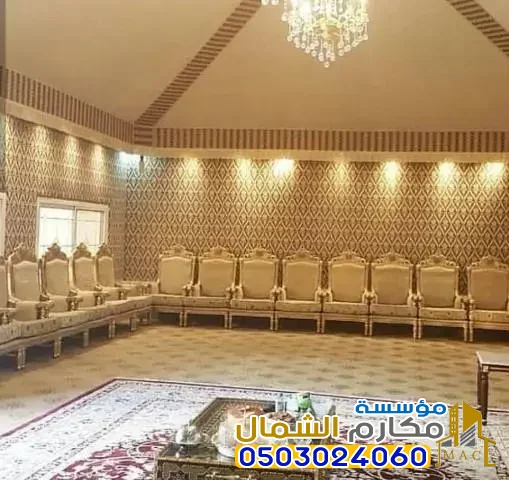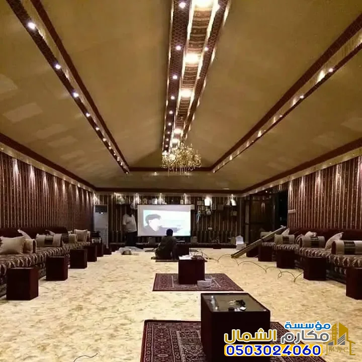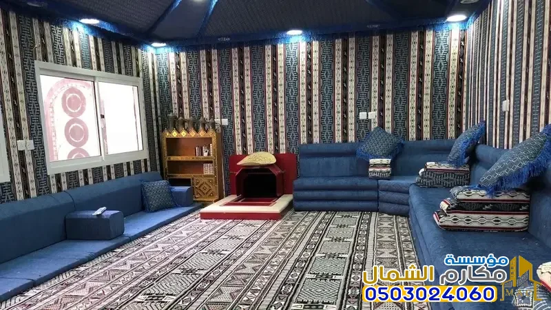 - الديكور الملكي الأصيل: يرتكز الديكور الداخلي على استخدام قماش السدو والبطانة القطنية المزخرفة، مع التركيز على الألوان الدافئة مثل الذهبي والبني والأبيض الملكي. يتم توفير أثاث فاخر من مجالس ومساند وطاولات بأعلى مستويات الجودة والذوق.